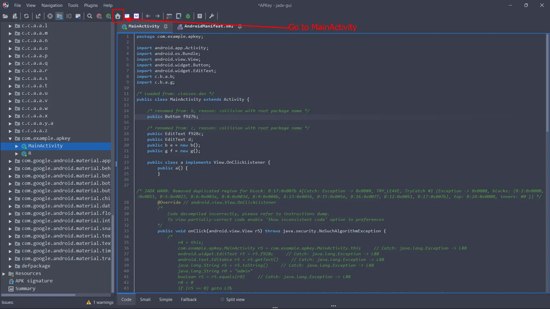 Once the APKey.apk is opened with Jadx, we can simply quickly navigate to the MainActivity clicking on the Home button on the top bar: